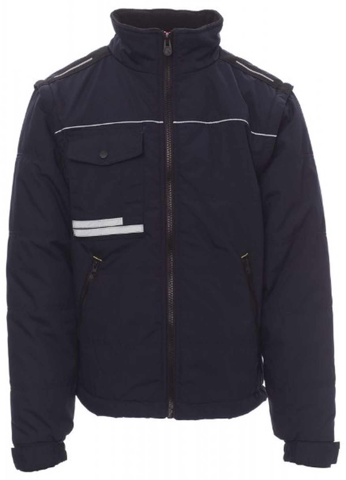 Fermeture zip de 8 mm en plastique avec curseur en métal. Capuche escamotable. 2 grandes poches zippées. Grande poche poitrine multifonction avec bandes réfléchissantes. Anneau porte-badge. Arrière profilé. Intérieur matelassé et doublure haute densi