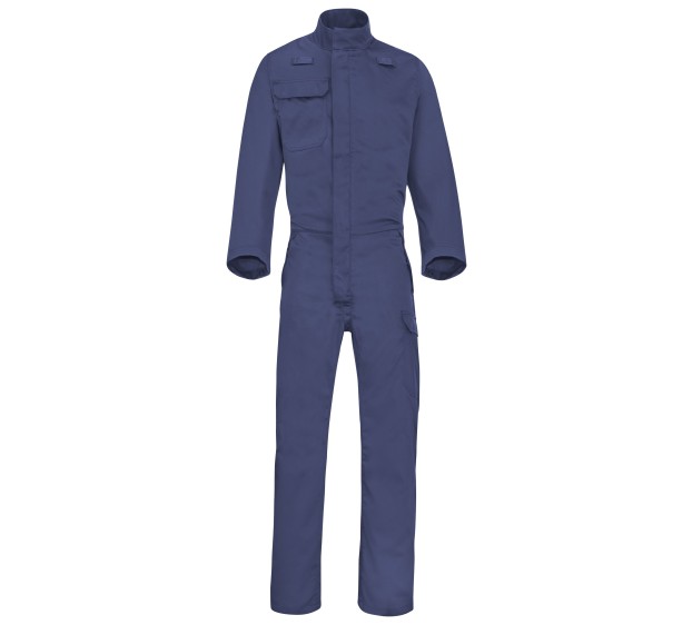 Combinaison 100% coton traité France, 330 g/m2. À l'avant fermeture à glissière sous patte maintenue par pressions cachées. Passants porte-dosimètre, dos élastiqué. 1 poche à la poitrine sous rabat fermé par pressions cachées, 2 poches italiennes sou