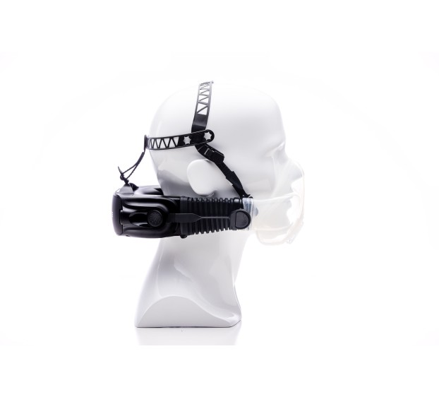 Demi-masque transparent en silicone souple qui s'adapte facilement au visage avec un harnais facile à attacher. Valve d'expiration en polycarbonate. Harnais en polyéthylène haute densité, nylon, silicone haute résistance. Léger, confortable et durabl