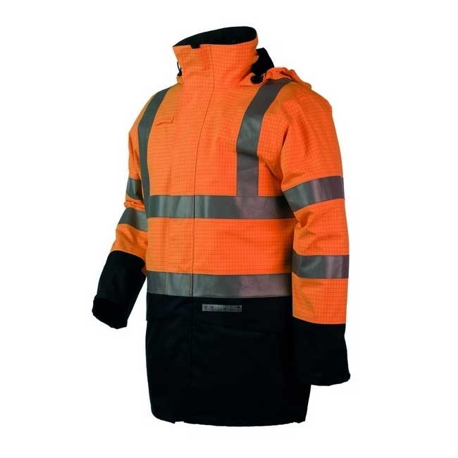 Parka étanche haute visibilité, ignifugée et antistatique. Tissu avec couche supérieure déperlante. Col droit. Fermeture par glissière sous-patte et bande autoagrippante. 1 poche poitrine plaquée, 2 poches plaquées avec soufflet. Longueur dorsale 85