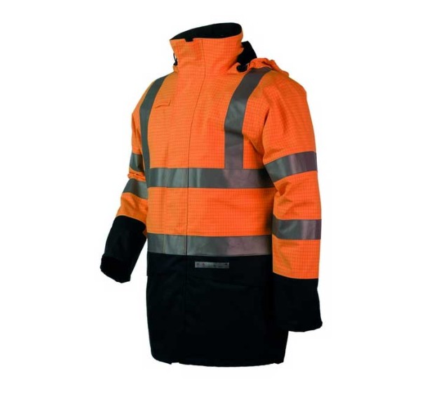 Parka étanche haute visibilité, ignifugée et antistatique. Tissu avec couche supérieure déperlante. Col droit. Fermeture par glissière sous-patte et bande autoagrippante. 1 poche poitrine plaquée, 2 poches plaquées avec soufflet. Longueur dorsale 85