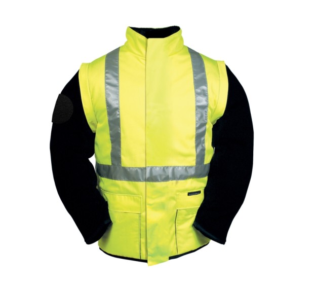 Blouson froid haute visibilité, avec manches polaires amovibles par glissière. Fermeture centrale par glissière jusqu'en haut du col. 2 poches basses plaquées avec rabat, 1 poche portefeuille intérieure. 38 % du poids du produit est recyclé.