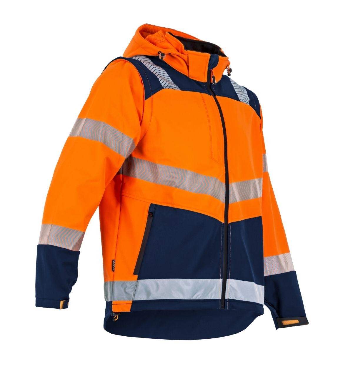 Veste softshell bicolore 100 % polyester. Intérieur polaire, haute visibilité à manches et capuche amovibles. Bas de manche ajustable, poche zippée poitrine, 2 poches basses fermeture par zip waterproof. Dos allongé.