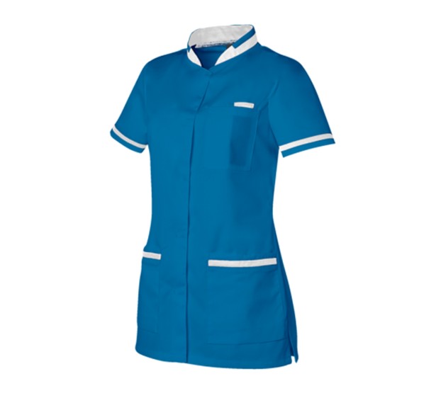 Tunique femme, col officier bicolore. 2 manches montées courtes, pinces poitrine au dos. 1 poche à la poitrine, 1 poche stylo à l'intérieur de la poche poitrine, 1 boutonnière sur la poche stylo, 2 poches basses fermeture par gripper. Sur le devant,