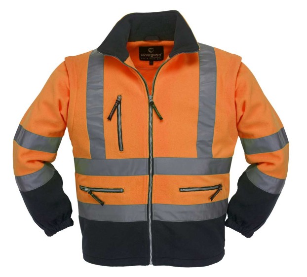 Matière extérieure polaire fluorescent 100 % polyester 330g/m². 8 bandes rétro-réfléchissantes (2 ceintures, 2 brassards par manche, 2 bretelles dos et devant). Fermeture simple glissière en plastique avec curseur métal jusqu'en haut du col. Col droi
