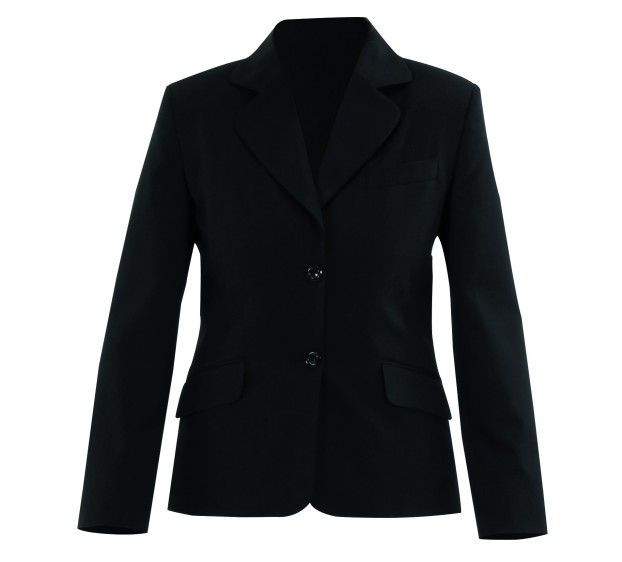 Veste costume 73 % polyester / 25 % viscose / 2 % élasthanne, 220 g/m². Col tailleur, épaulettes, 2 poches basses à double passepoil et rabat, 2 poches intérieures passepoilées. Découpes devant et dos. 3 boutons bas de manche sans boutonnière. Fe